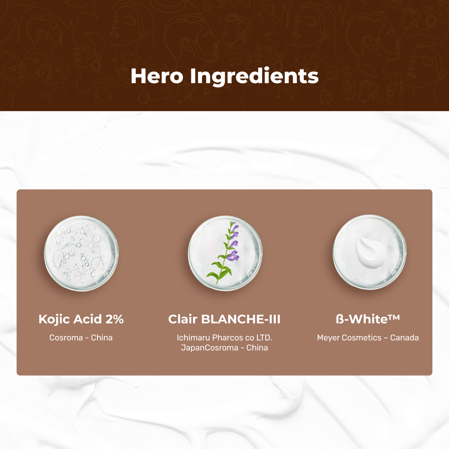 Fade dark spots, pigmentation and uneven tone with the power of 2% Kojic Acid + Clair Blanche III + Niacinamide — packed in a lightweight serum-cream formula that absorbs fast and delivers visible brightness without irritation.